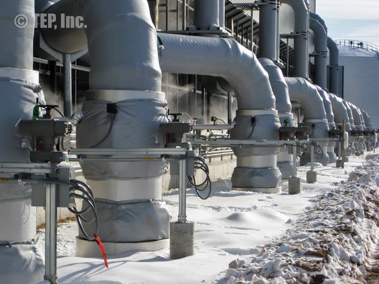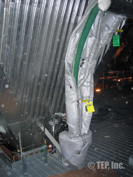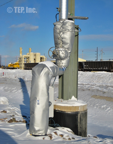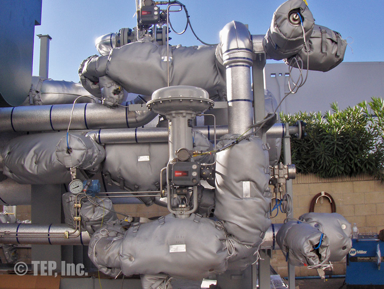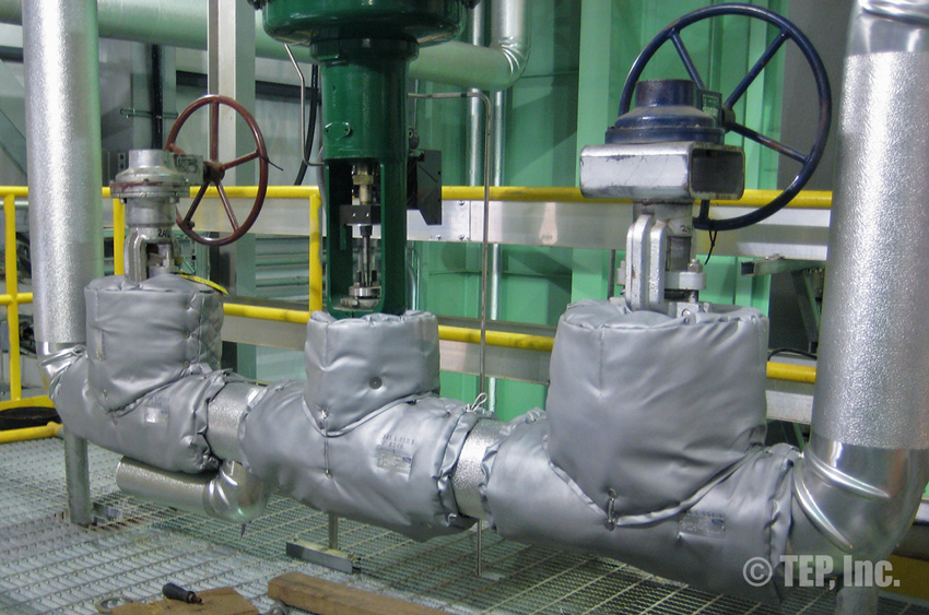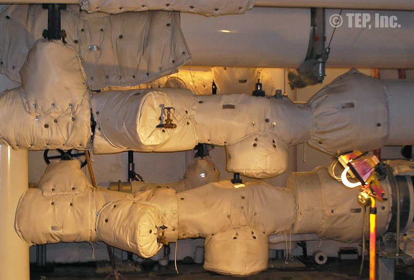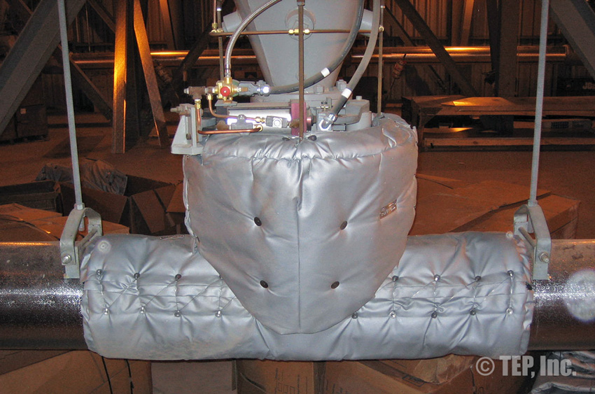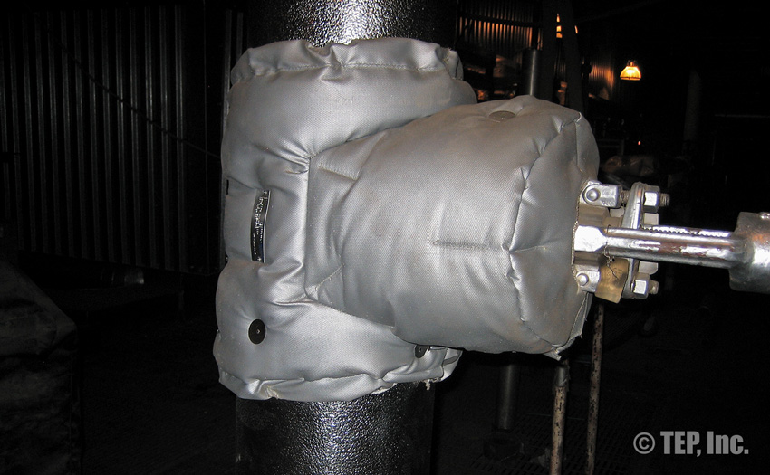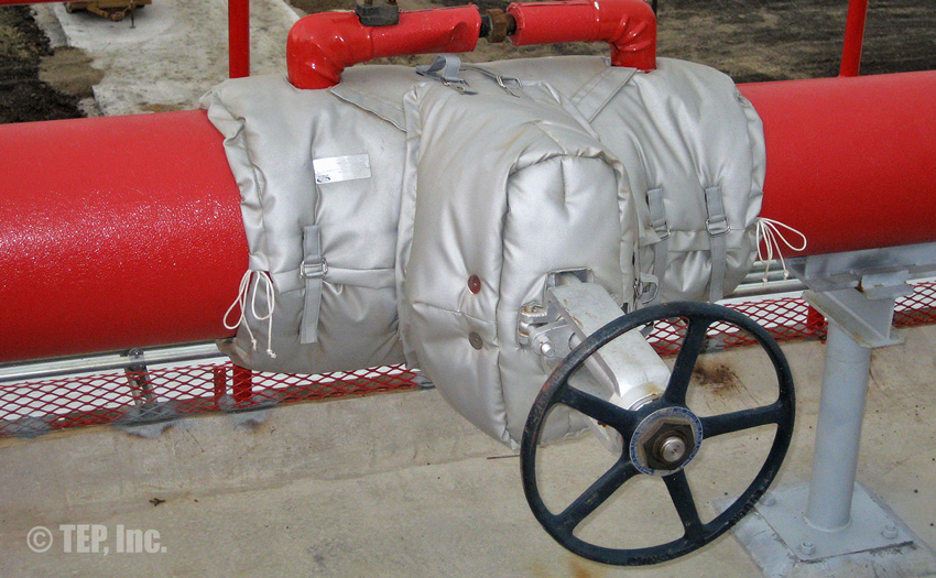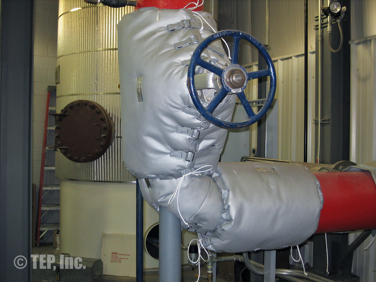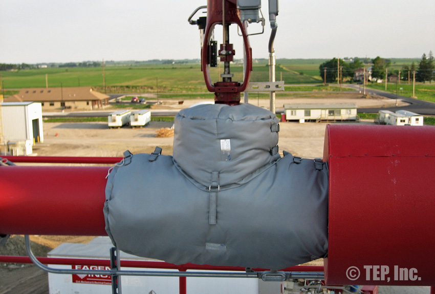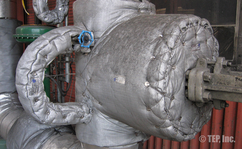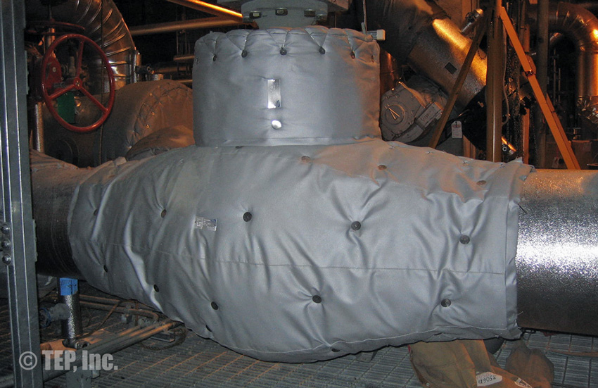 When insulated pipe fittings require periodic inspection or maintenance, the insulation must be removed. The TEP “Energy-Wrap” removable/reusable insulation blanket is the cost-effective solution to the re-insulation. Applications such as flanged pairs, blind flanges, flanged valves (gate, globe, check, ball, butterfly, plug, control, etc), strainers, expansion joints, flow meters, filters, elbows, regulators, pipe spools, or any other piping components that require maintenance and should be insulated.